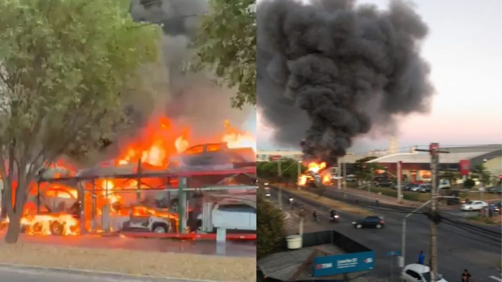 Ao menos 11 veículos foram atingidos pelas chamas e equipes continuam no espaço para controlar a situação